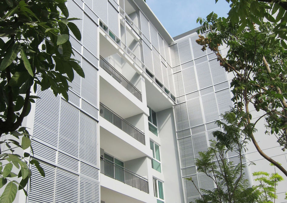 โครงการกรีนเนอรี่เพลสเลือกใช้ระแนงอลูมิเนียมตกแต่งภายนอกอาคาร เพื่อช่วยบังแดดและบังสายตา เพิ่มความเป็นส่วนตัวอีกทั้งยังช่วยสร้างมิติของแสงเงาในห้องพัก โดยบานเลื่อนระแนงอลูมิเนียมนี้ยังสามารถเลื่อนเปิดปิดได้ตามความต้องการของผู้ใช้งาน
